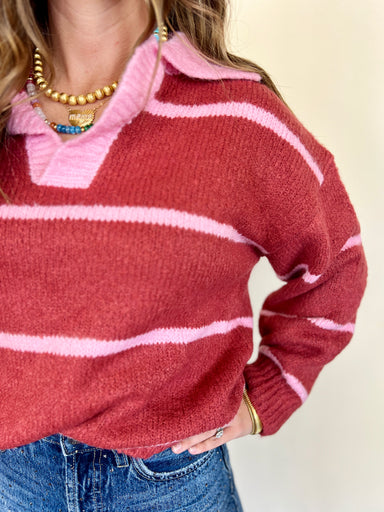 Meet the Hallie Sweater—a fitted button-up that blends timeless style with subtle detail. Designed in rich mocha and soft cream stripes, this sweat...