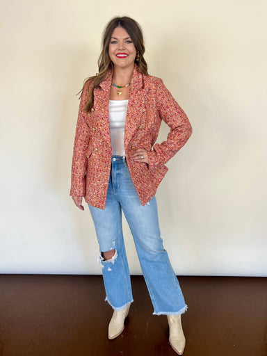 Add a playful twist to your fall wardrobe with this textured button-up cardigan. Featuring a cozy red-and-cream knit and standout mismatched button...