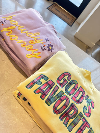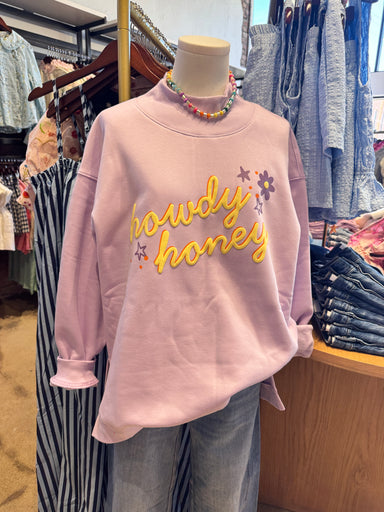 Sweet meets western charm in this dreamy lavender oversized sweatshirt featuring the playful phrase “Howdy Honey” in bold, dimensional script. The ...