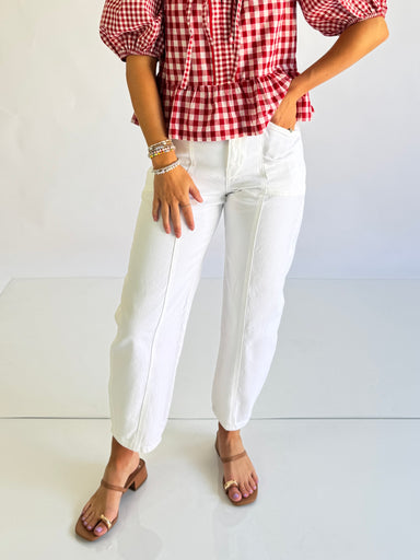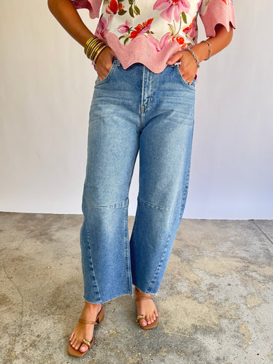 The Westward is a high rise jean with a barrel leg silhouette. Featuring a cinched waist, bowed leg, and slightly tapered ankle against a vintage-i...