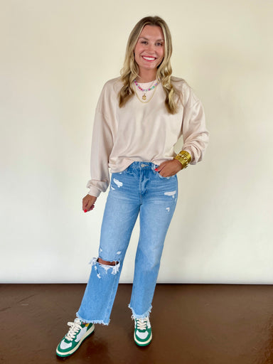 A simple essential with subtle personality. This long sleeve sweater features a clean silhouette in the perfect olive, finished with a single sardi...