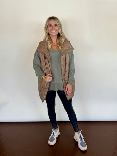 A simple essential with subtle personality. This long sleeve sweater features a clean silhouette in the perfect olive, finished with a single sardi...